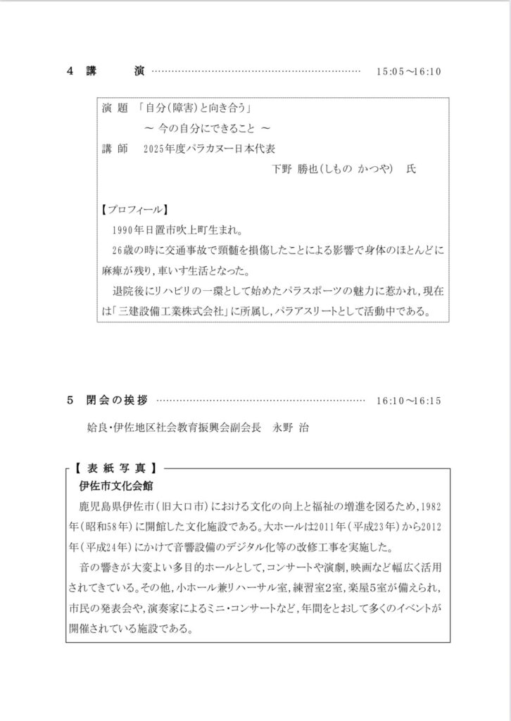 姶良伊佐地区生涯学習推進大会 2026-02-02 最終更新日時 : 2026-02-03 katsuya shimono 2026.2.1伊佐市文化会館で開催された生涯学習に講師として参加してきました。みなさん真剣に話を聞いてくださり、感謝です。ありがとうございました。今後もこのような機会がございましたら、どんどん積極的に参加したいと思いました。 Screenshot Screenshot Screenshot Follow me! Bluesky